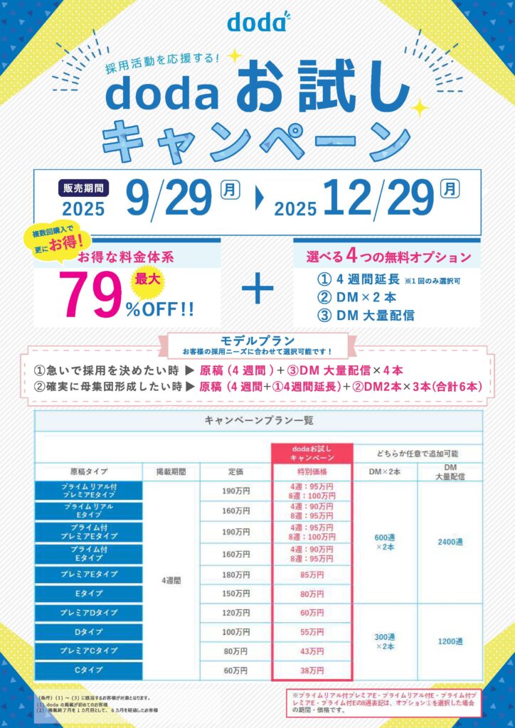 【doda】dodaおためしキャンペーン♪doda掲載が「初めて」or「久しぶり」な企業様へ♪
